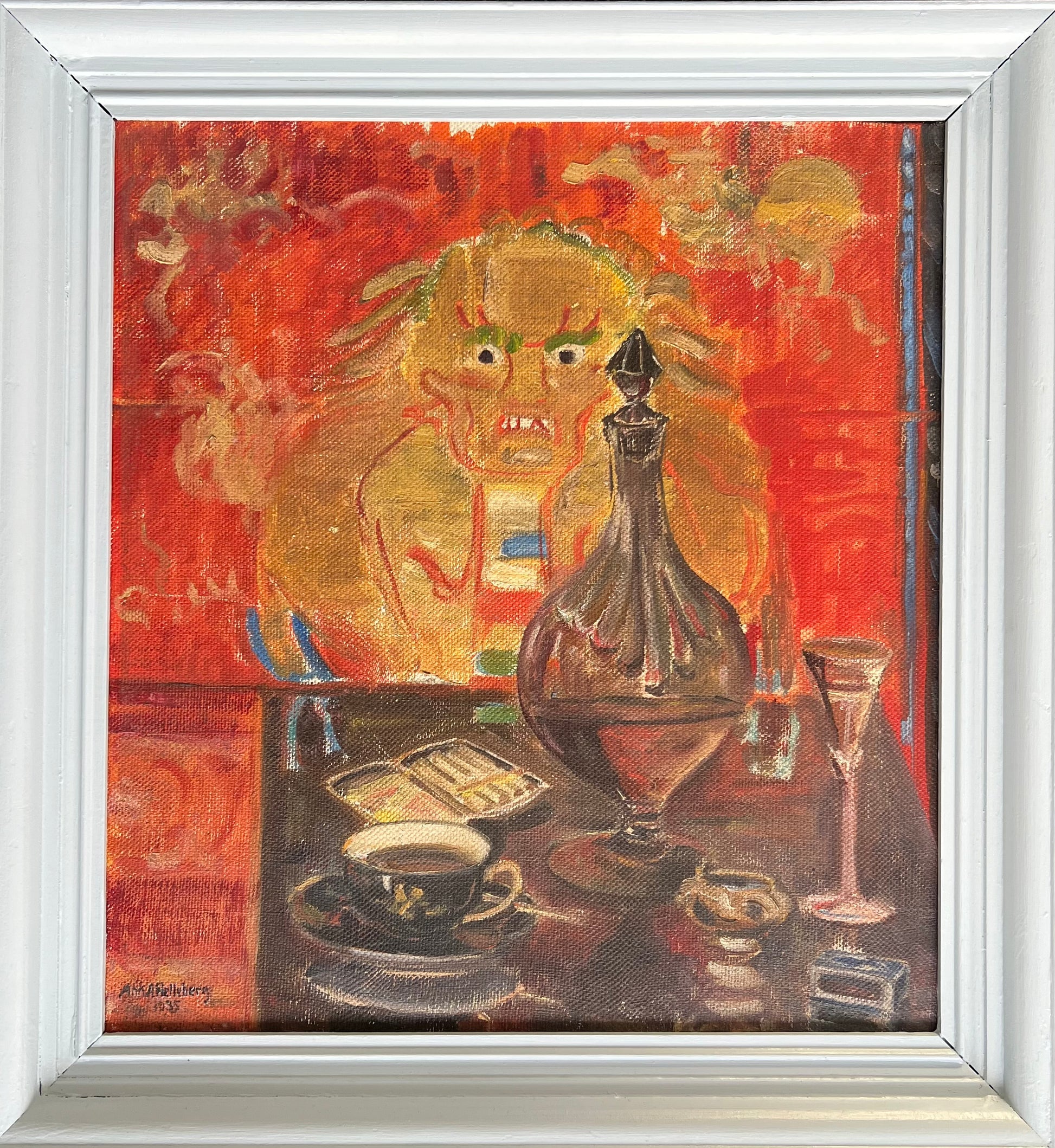 Anna Helleberg (1874-1964). Interior with a phantom, oil on canvas, signed and dated 1935. 45,5x41 (56,5x52) cm. grey painted wood frame.