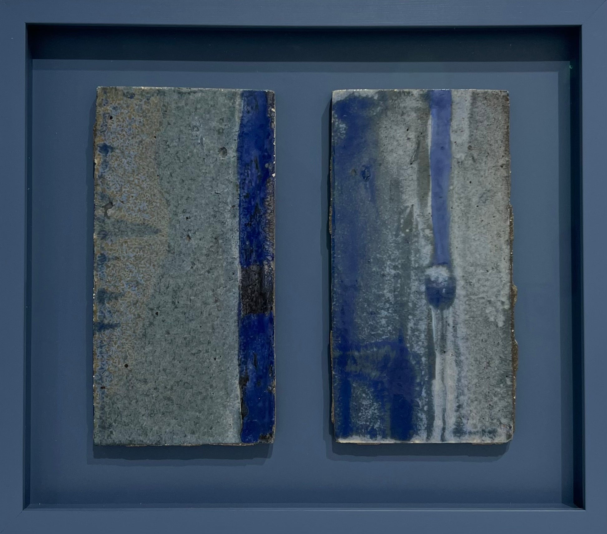 Else Fischer-Hansen (1905-1996). Two stoneware tiles from the decoration of Crome & Goldschmidt, Copenhagen, 1958. The decoration was made with Royal Copenhagen. New handbuilt wood frame, museumglass. Tiles 25 x 12 cm each. Frame: 37 x 42 cm.