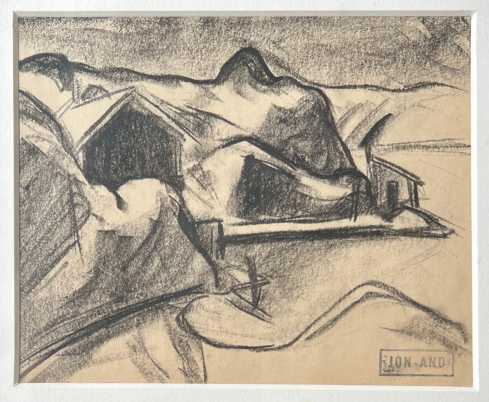 John Jon-And (1889-1941). Landscape, charcoal on paper, stamp signature. 16 x 19 (25 x 27) cm. Black painted wood frame.