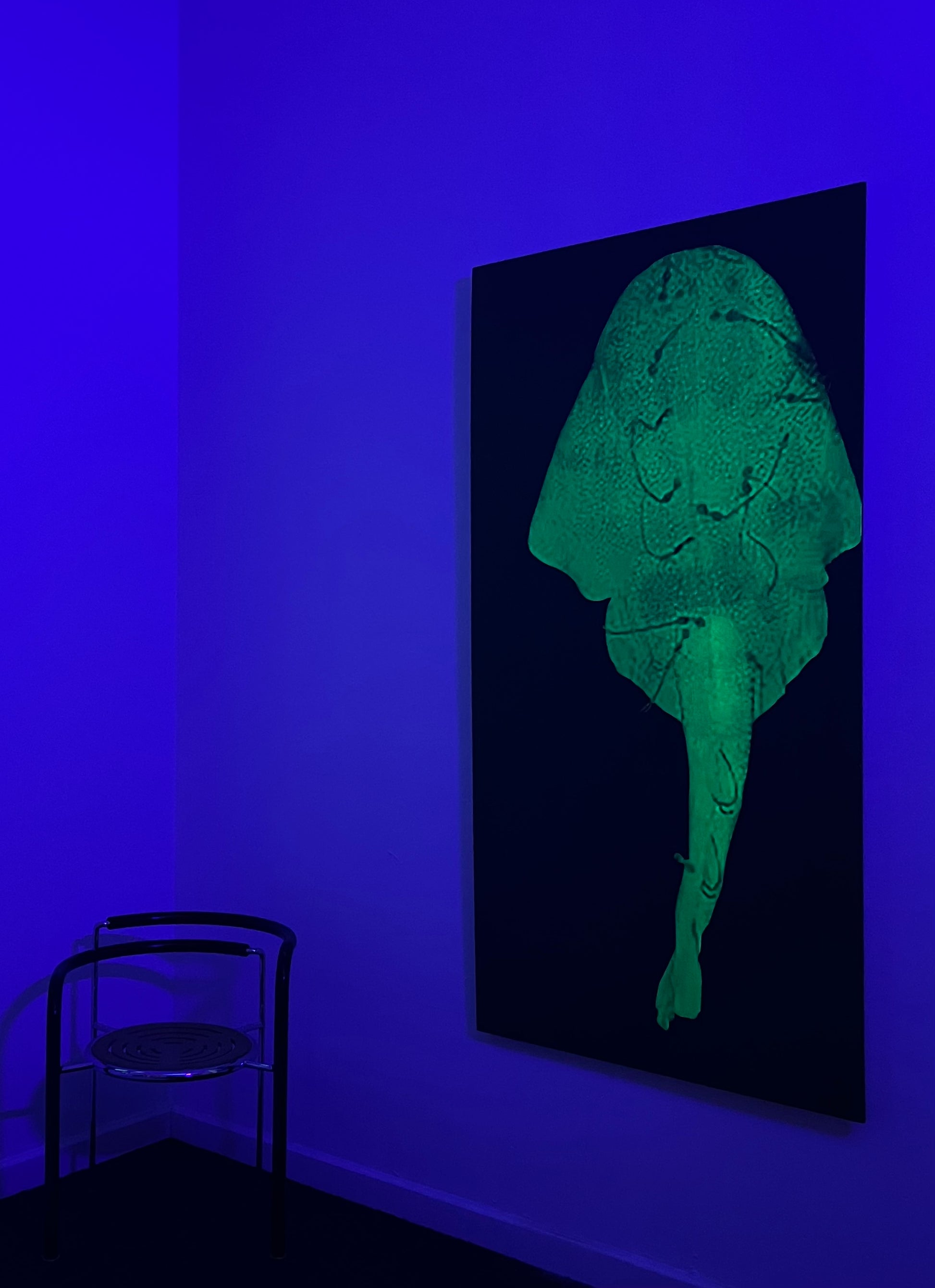 The print is made with UV colours- the last photo shows the effect.