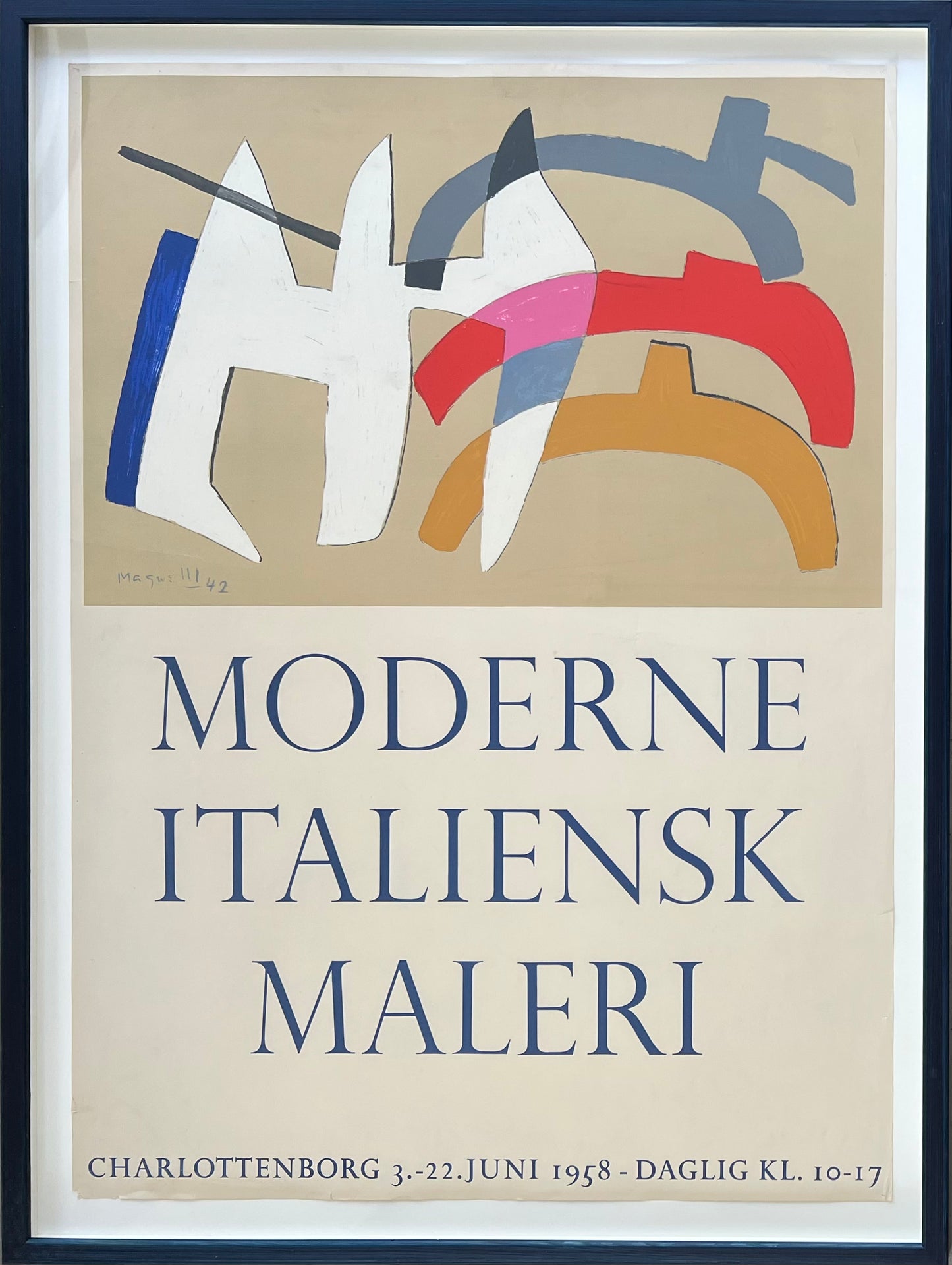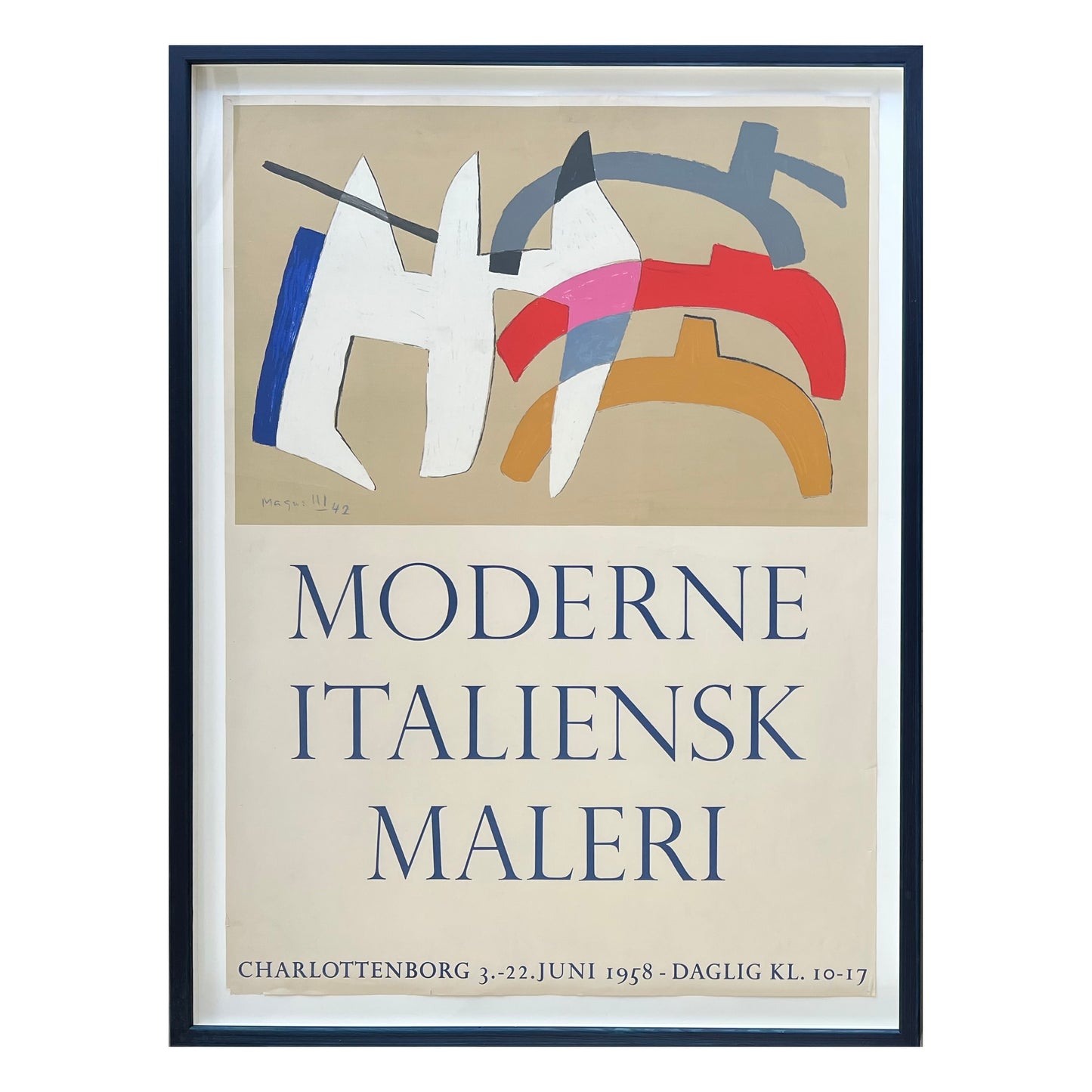 "Modern Italian Painting, Charlottenborg, 1958", exhibition poster, screen print, with screenprint after Alberto Magnelli. 84 x 61 (94 x 70) cm. New handpainted frame, acid free mounting.