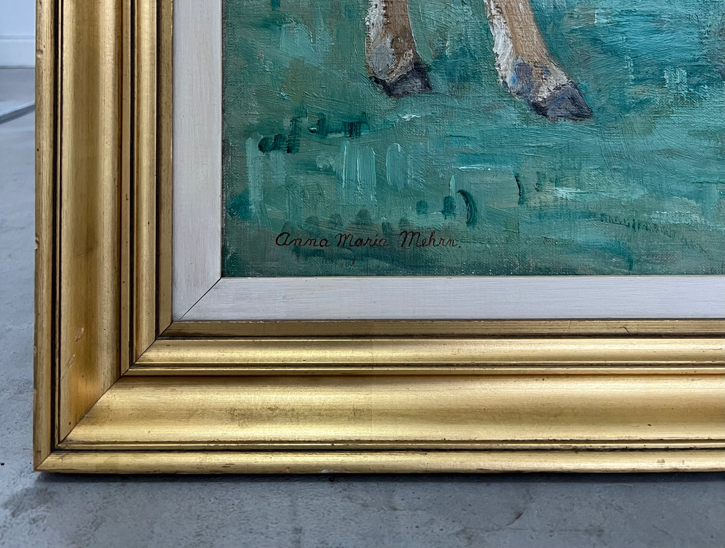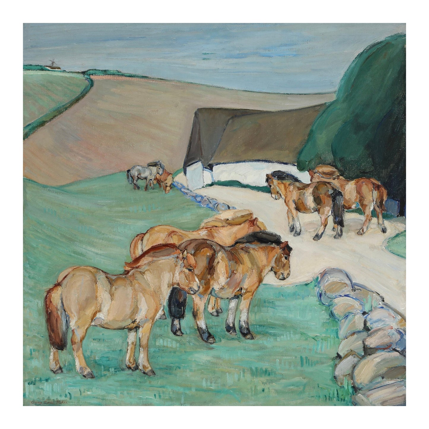 Anna Maria Mehrn (1889-1976).”Islandske heste udenfor en jysk bondegård”, oil on canvas, sign. Anna Maria Mehrn 1917. 101×101 (115 x 115) cm.