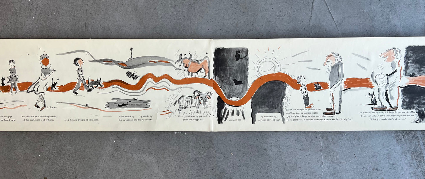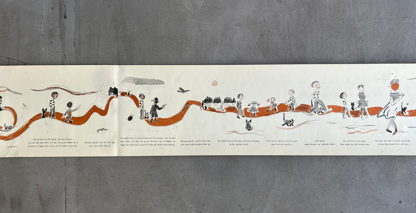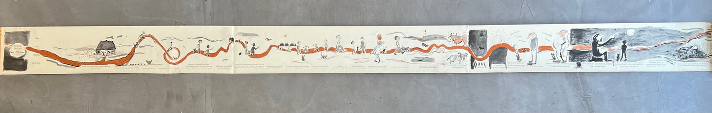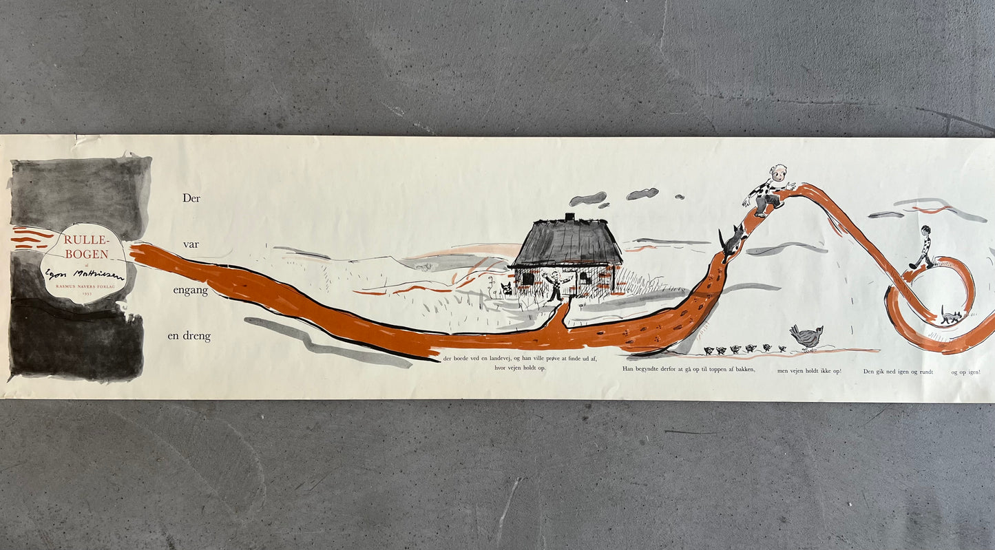 Egon Mathiesen (1907-1976). “Rullebogen”, roll out childrens book, including original cover/tube, Rasmus Navers Forlag 1953, printed by a/s Recato, very rare. 21 x 310 cm. Some wear.