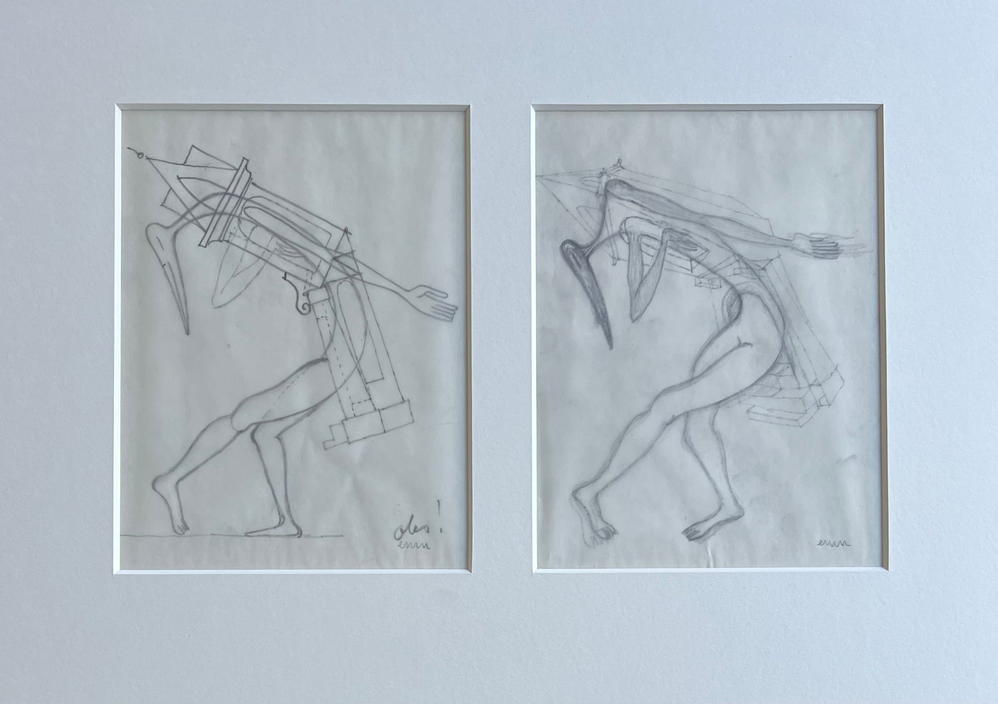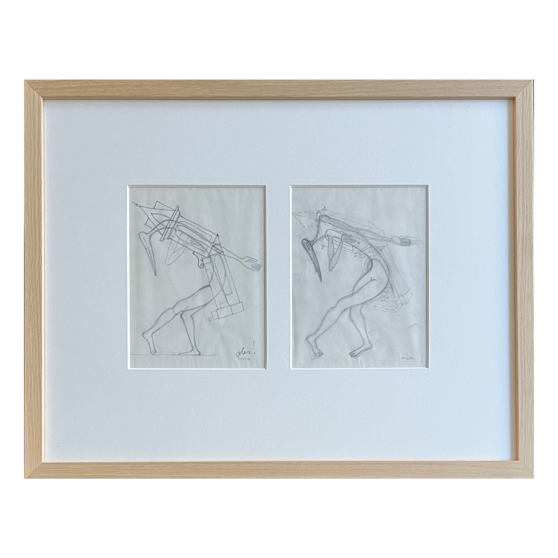 Egon Møller-Nielsen (1915-1959). “Bizarr balett”, pencil on paper, two drawings in one frame, both signed. 20 x 15 & 20 & 15 (43 x 56) cm. Oakframe, museumglass.