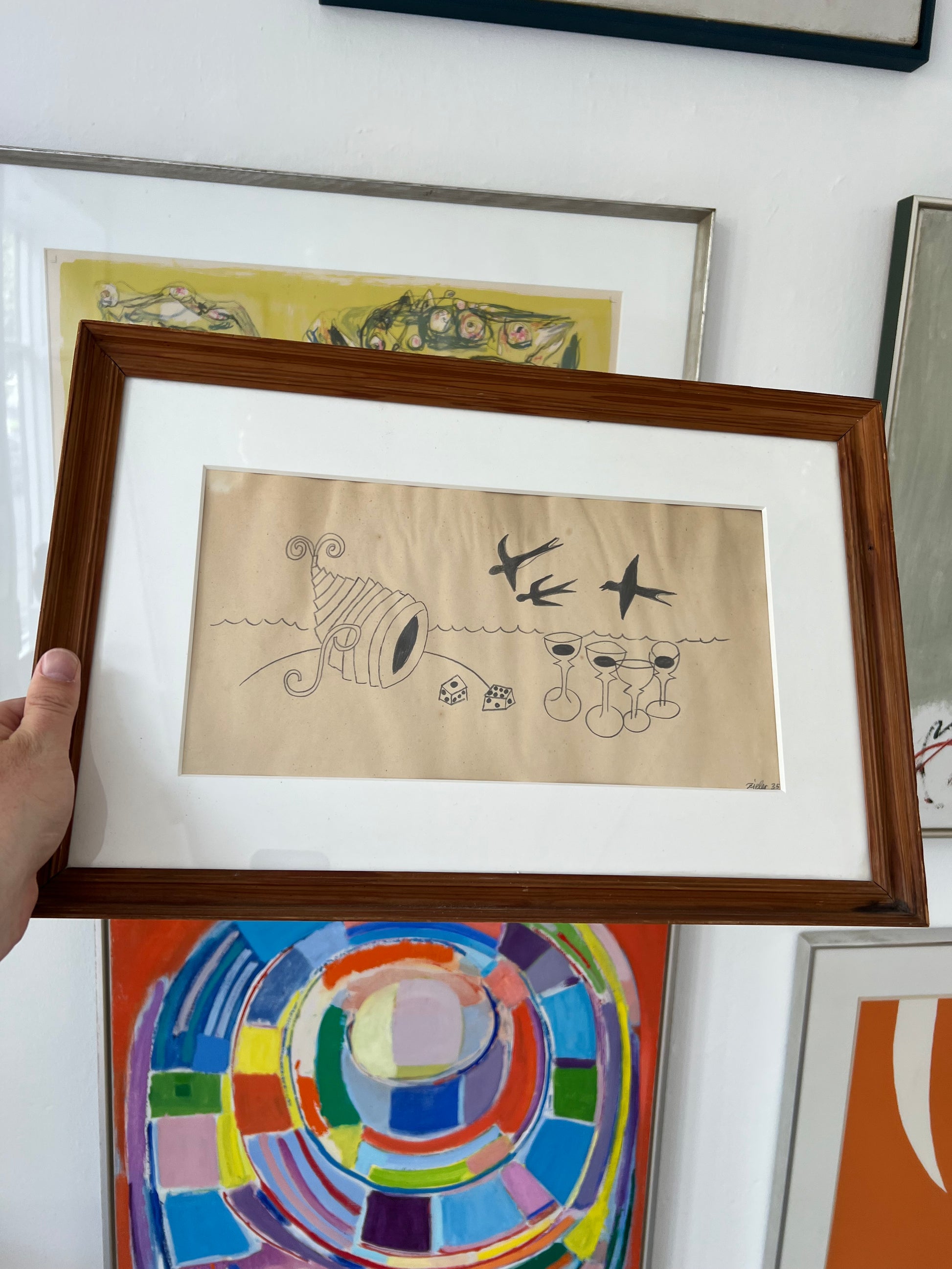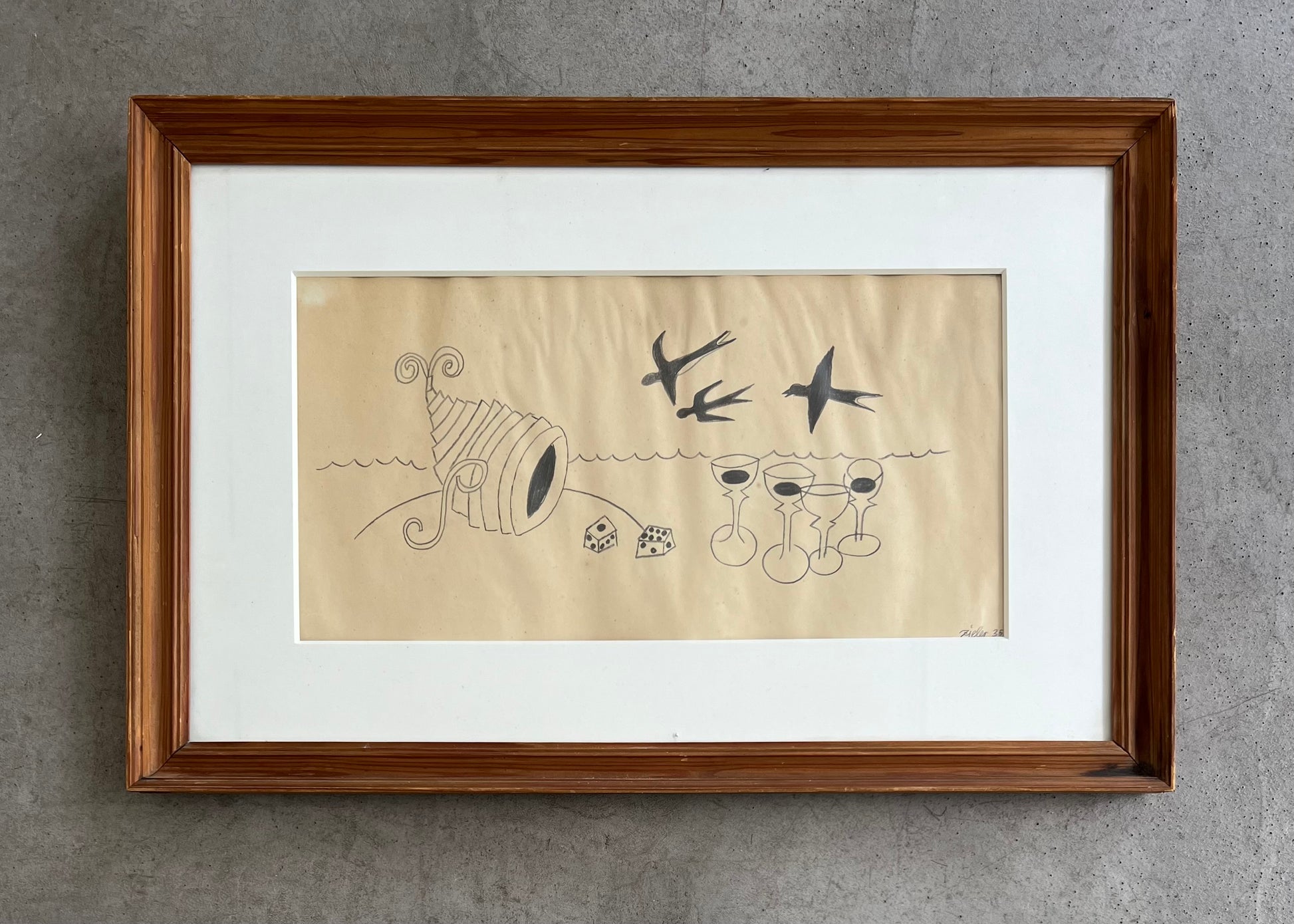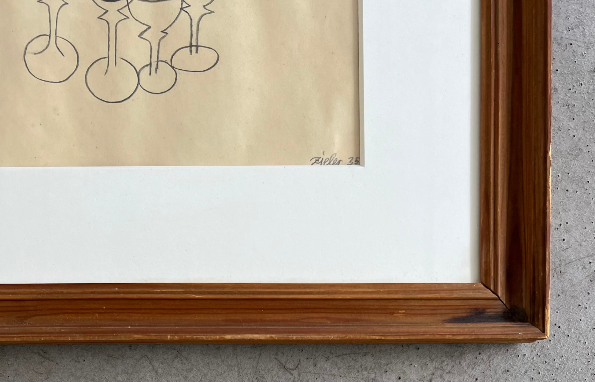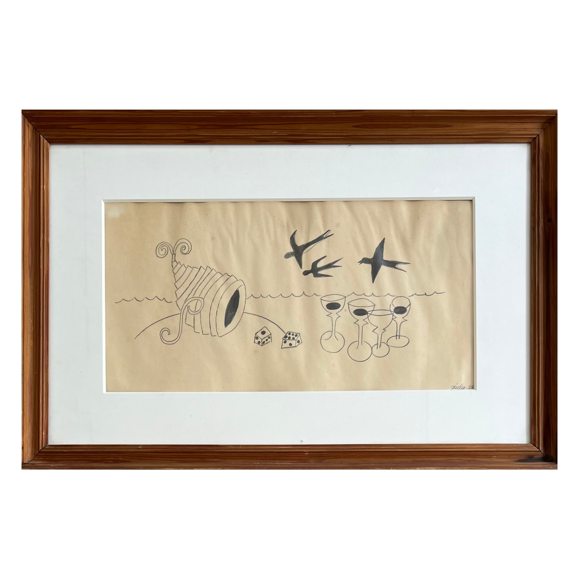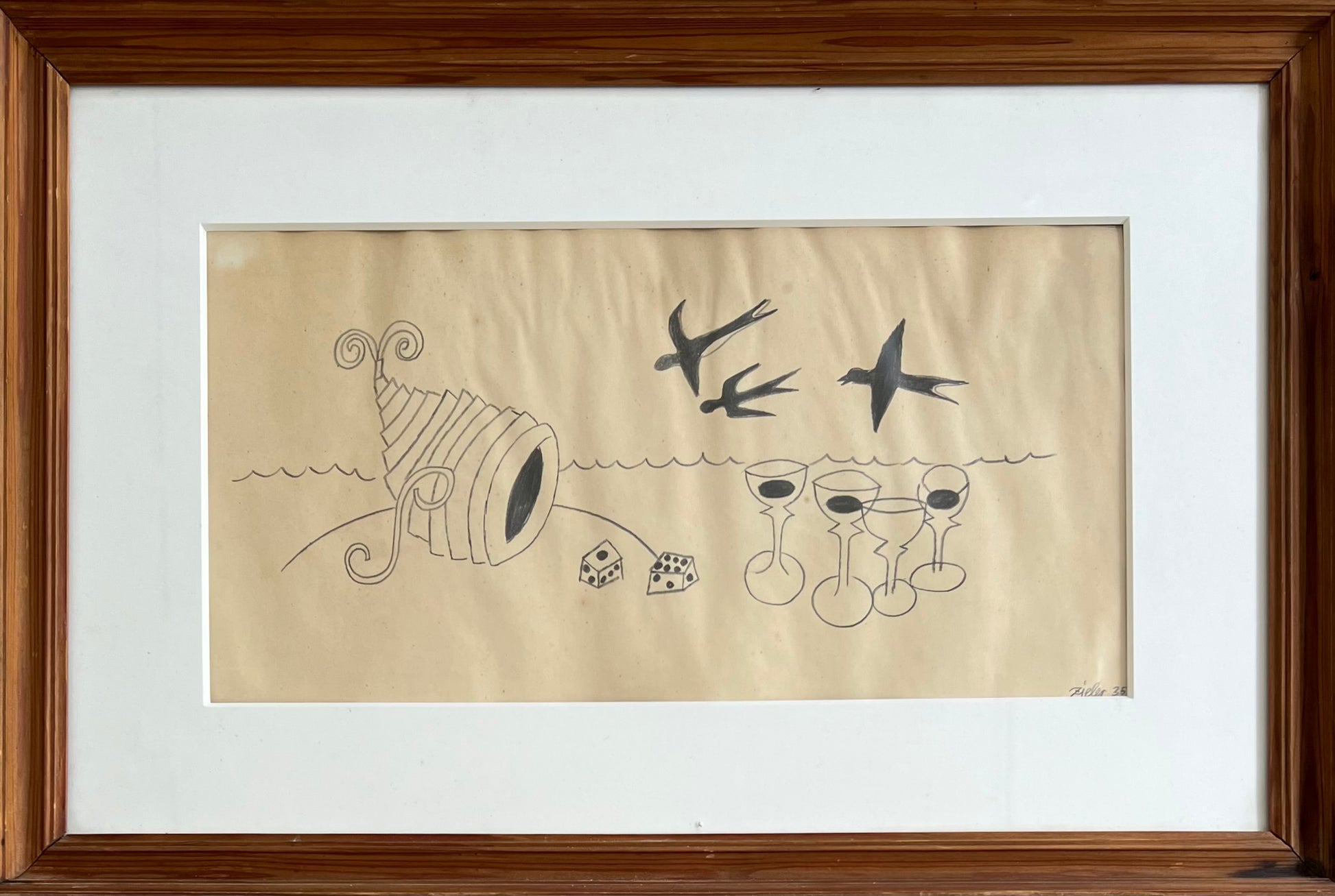 Mogens Zieler (1905-1983). “Tegning til syv fantastiske fortællinger”, Pencil on paper, signed and dated. 18 x 34 (33 x 49) cm. Framed. Wear.