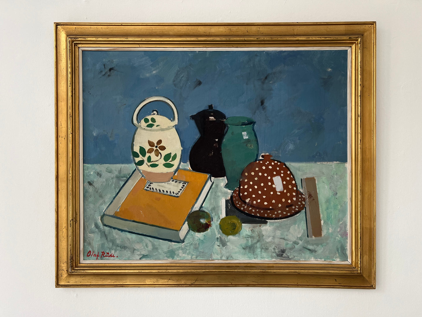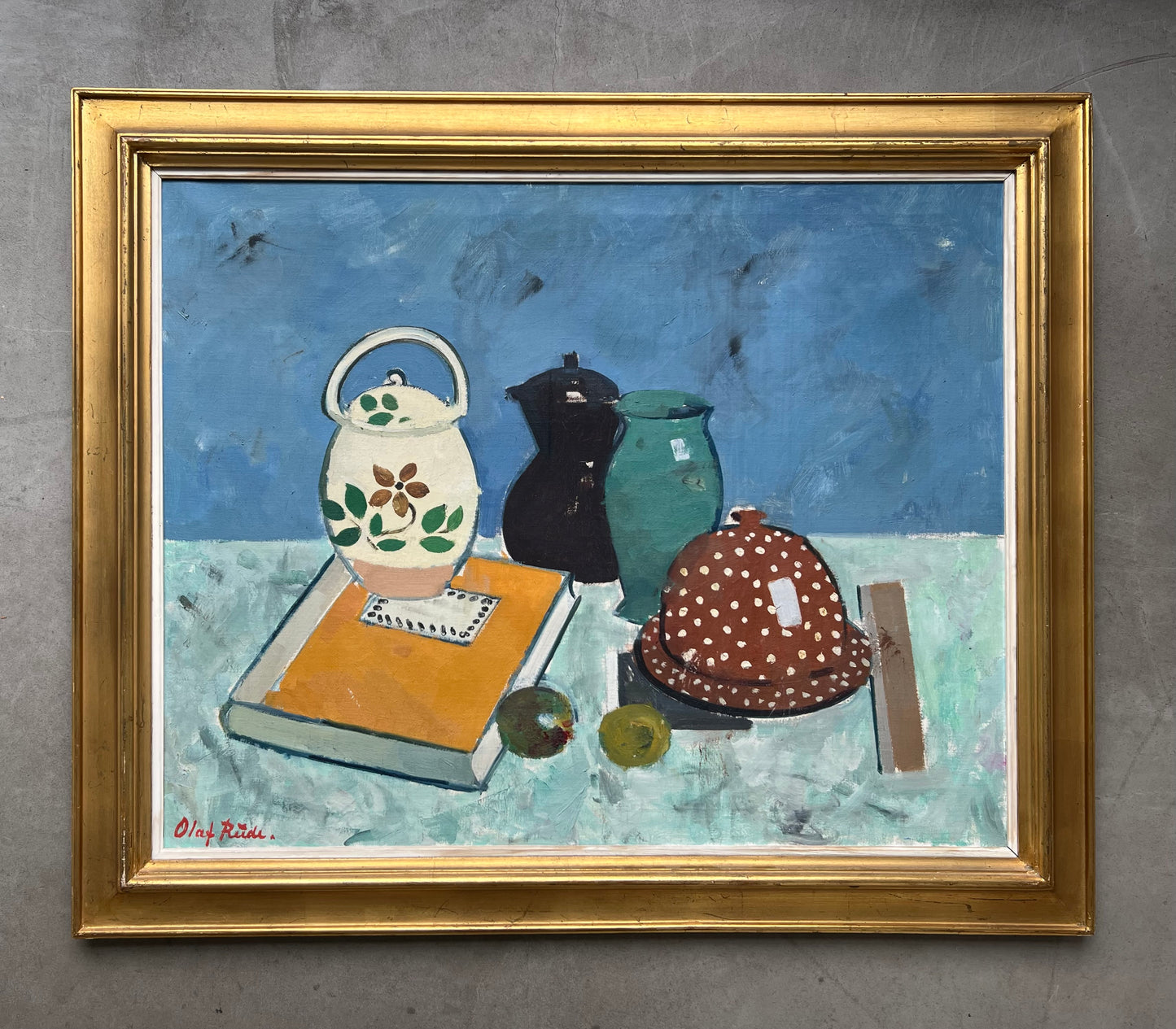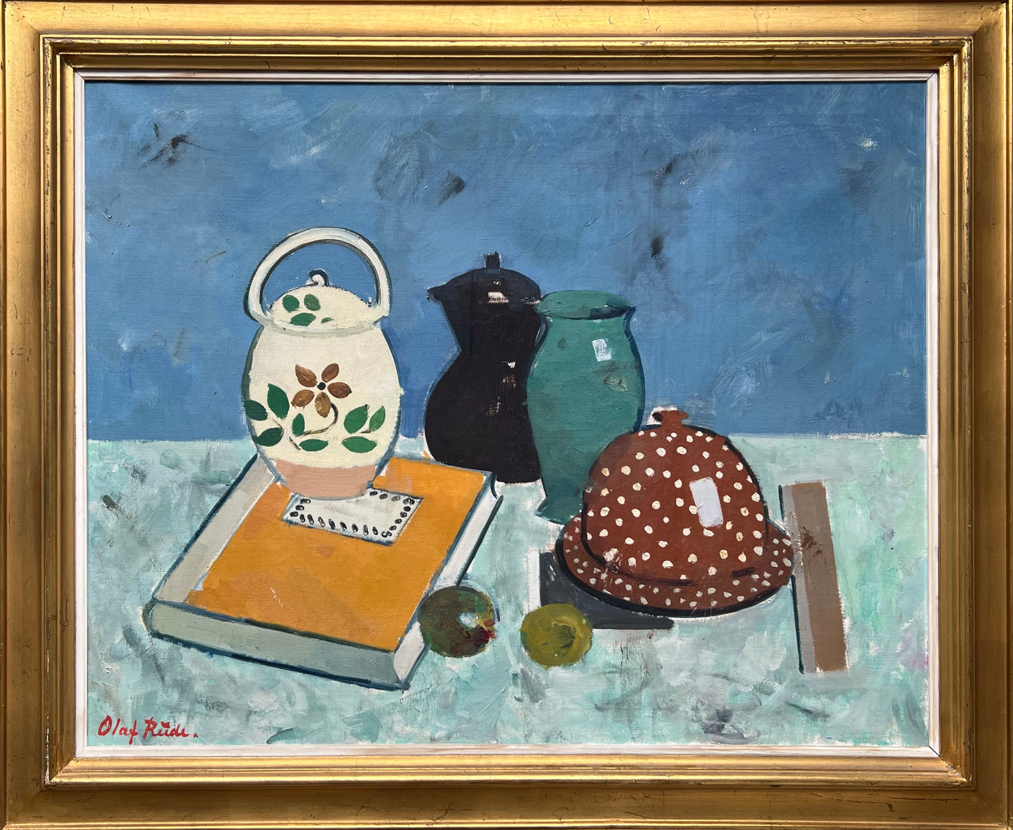Olaf Rude (1886-1957). Stillife with book and ceramics, oil on canvas, signed Olaf Rude. 73 x 93 (91 x 109) cm.