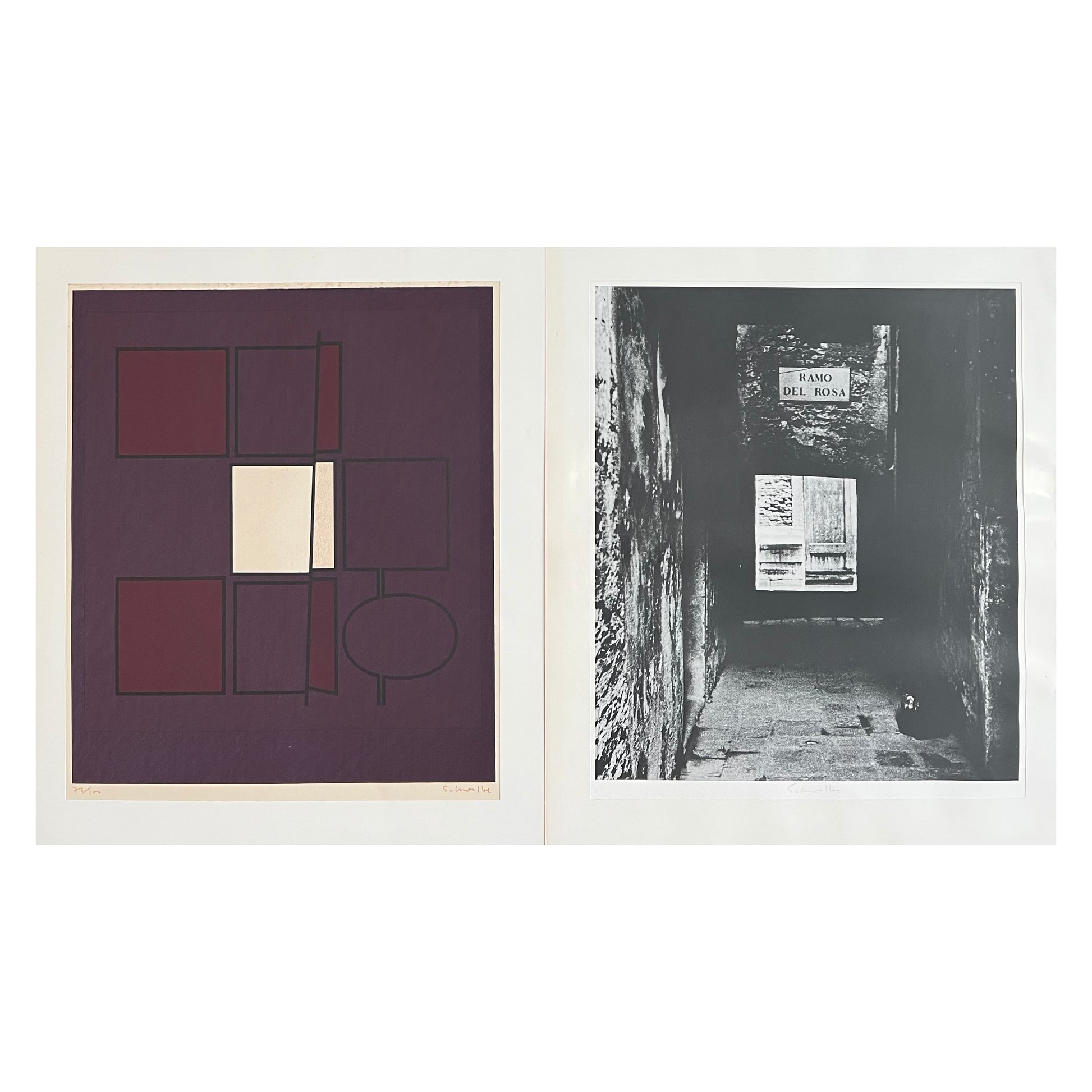 Ole Schwalbe (1929-1990). Compositions from “Romerske Synonymer”, lithograph and offset photo, 73/100, both signed. Each 46 x 38 (58 x 47) cm. Faded. Some spots. Unframed.