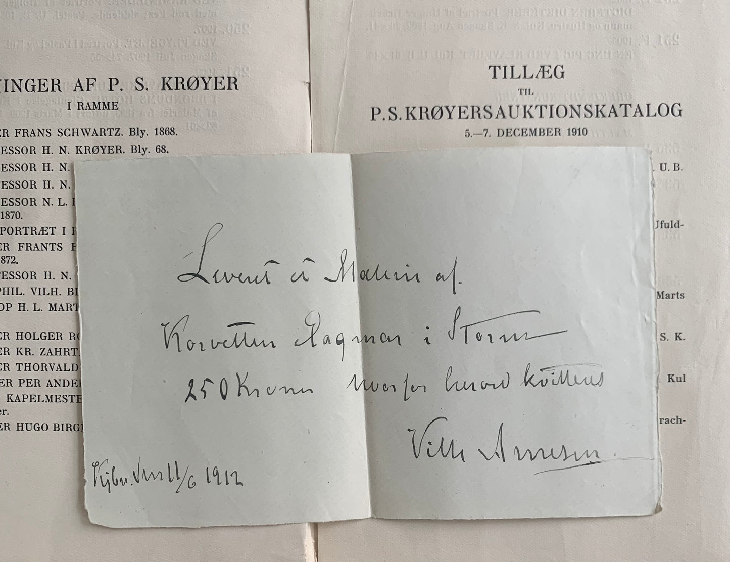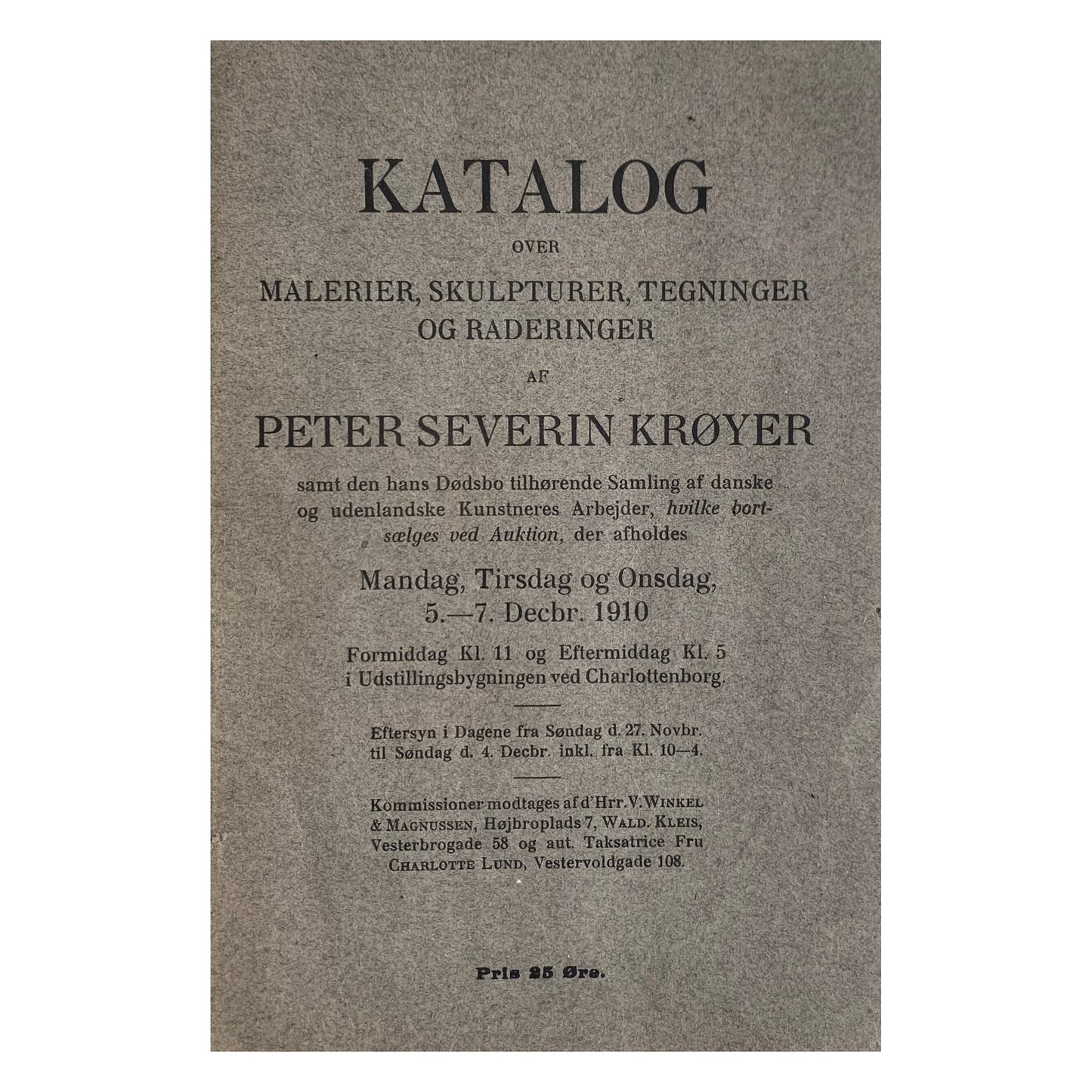 Peter Severin Krøyer (1851-1909). “Katalog over malerier, skulpturer, tegninger og raderinger af Peter Severin Krøyer”, Charlottenborg 1910. Containing receipt for two lot numbers and receipt from painter Vilhelm Arnesen. 20 x 13 cm. Back with some wear, inscribed with sales prices.